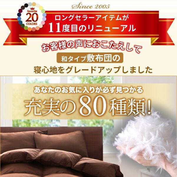 | 商品の特徴 | 新20色羽根布団8点セット - 家具専門店どあどあ(西山商店)その他の画像など詳細はこちら(PC版)でご確認ください。 関連商品 本商品のサイズ、色違い、関連商品はこちら 商品内容 布団8点セット 和タイプ⁄シングル パウダーブルー 〈3年保証〉新20色羽根おかげさまで選ばれて15年 新品 送料込 羽根布団 シングルサイズ 豪華8点セット和布団タイプ MG 新EC市場No.1シリーズ通算65万セット突破 布団8点セットベッドタイプシングル パウダーブルー 〈3年保証〉新ネット市場No.1シリーズの秘密は「圧倒的なお得感」と「史上最多のカラバリ」 新20色羽根布団8点セット(ベッドタイプ\u0026和タイプ:各5サイズ)の激安羽根布団8点setver.11thトレンドに流されない定番20カラー お布団もカバーも20色×3サイズ×2タイプの80種類から選べるどの色にしよう?選べて楽しい20色Since2005ロングセラーアイテムが11度目のリニューアル お客様の声におこたえして 和タイプ敷布団の寝心地をグレードアップしましたあなたのお気に入りが必ず見つかる充実の80種類!・和タイプ敷布団寝心地グレードアップ ・オールシーズン大活躍の8点セット ・どんなお部屋&家具にも合うステキな20色 ・厳選水鳥スモールフェザー使用 ・選べるタイプ和タイプ・ベッドタイプ3サイズ展開!シングル/セミダブル/ダブルISO9001:2015基準クリア安心赤ちゃん品質 3yearwarranty品質保証3年この品質で、この価格は他では見つかりません! 充実の8点セット/ふわふわ羽根100%お客様の声におこたえして 和タイプ敷布団の寝心地アップ ※和タイプはシングルのみしっかり支える極厚中芯入り3層構造 ふかふか感を生かしたまま、床付き感をグッと軽減。 おかげさまで選ばれて15年 EC市場No.1シリーズ通算65万セット突破 選ばれ続ける理由があります。 発売以来15年以上も進化を続ける新20色羽根布団8点セットは、現在<全80種類>。 どんなお部屋にも合うカラーはもちろん、使いやすさ、お求めやすい価格も追及しています。 セット内容・色・サイズがここまで揃った布団セットは他にはありません。 だから、選ばれています! 「1人暮らし単身赴任に」「ご家族用お客様用に」「子供部屋二段ベッドに」「別荘に下宿に」「旅館に社員寮などに」人気の理由1 1年中使える充実のフルセットがとってもお買得 おやすみに必要なものはすべてセットされているので、届いたその日から快適に眠ることができます。 他に買い足す必要はありません!Set内容?届いてすぐに眠れる8点set?3yearwarranty 1.羽根掛け布団 2.敷き布団※ベッドタイプは敷きパッド 3.枕 4.洗える掛け布団カバー 5.洗える敷き布団カバー※ベッドタイプはボックスシーツ 6.洗える枕カバー 7.洗い替え用枕カバー 8.収納ケース ※ダブルサイズは、枕・枕カバー・洗い替え用枕カバーが2つずつの11点set収納に便利なケースつき 使わない時はコンパクトに収納できるので、来客用や予備の保管に便利です。お手入れカンタン!気軽に洗える! 「掛け布団カバー」「敷き布団カバー」「枕カバー」 ご家庭の洗濯機で丸洗いできるので、こまめに洗えて楽ラクうれしい! ※洗濯機の製造メーカーの容量をご確認の上、ネットに入れて洗ってください。?人気の理由2 お部屋のスタイルにも、家具にも合う オシャレな20色から選べる お部屋のイメージに合わせて、カラーを選んで。「あなたらしい暮らし」を優雅に明るくシックに彩ります。それぞれの部屋にぴったりの色を インテリアにとって、色はとても大切な要素。ベッドや床、壁の色など、あなたのお部屋に合う色をぜひ見つけてください。ナチュラルベージュ、アイボリー、ミルキーイエロー、ペールグリーン、パウダーブルー、ラベンダー、フレッシュピンク、 さくら、コーラルピンク、ローズピンク、サニーオレンジ、モスグリーン、オリーブグリーン、ブルーグリーン、 アースブルー、ミッドナイトブルー、ワインレッド、モカブラウン、サイレントブラック、シルバーアッシュ 人気の理由3 和タイプ&ベッドタイプ 暮らしに合わせて選べる シーンに合わせて選べる2タイプ和タイプ(たたみやフローリングのお部屋に)orベッドタイプ(洋室やベッドライフに)和タイプ(シングル)来客用のお布団としても人気 ベッドタイプ(シングル/セミダブル/ダブル)新生活のスタートに人気「和タイプ」はたたみ・フローリングはもちろん、ベッドにも。お好みに合わせて、タイプ・サイズをお選びください。シングル:100cm、セミダブル:120cm、ダブル:140cm(敷き布団・敷きパッドのサイズ)?人気の理由4 ふわふわたっぷりの厳選スモールフェザーだから 冬は暖かく、夏は涼しく温度調節 スモールフェザーは、外気の変化に合わせて、熱や湿気の吸収・発散をくり返し、 内部の温度を一定に!だから、冬は暖かく、夏は涼しいのです。 ふわっと暖か!厳選スモールフェザーとは 胸部などに生えているカーブした羽軸を持つしなやかで柔らかい小羽根のこと。 このセットの羽根掛け布団は、スモールフェザー100%仕