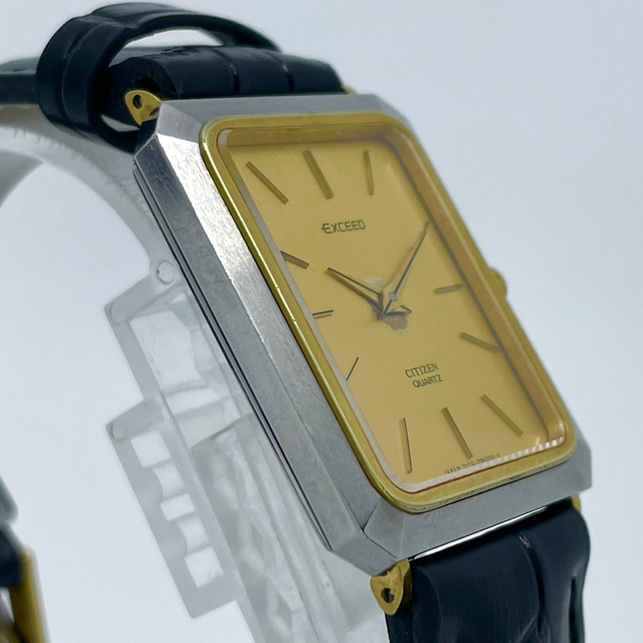 【電池交換済/新品ベルト(社外品)】美品 シチズン エクシード 腕時計 4-796233 メンズ クオーツ 角型 ゴールド文字盤 ブラックレザーベルト ビンテージ アンティーク ドレスウォッチ 薄型 エ