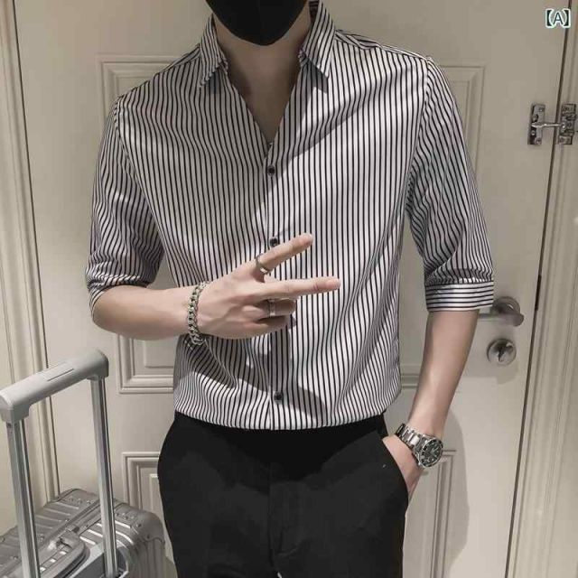 [M]秋冬 コーデ メンズ 服 シンプル ファッション オシャレ 大人 かっこいい 大きいサイズ ストリート 紳士服 黒 ストライプシャツ 韓国スタイル 七分袖 半袖 シャツ ジャケット