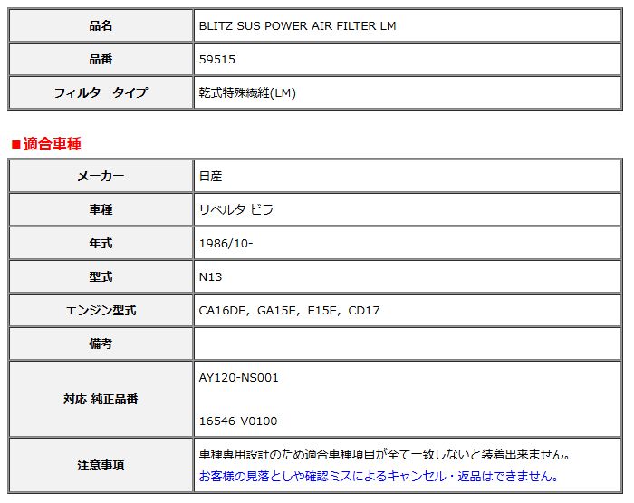 BLITZ ブリッツ サスパワー エアフィルター LM 純正交換タイプ リベルタ ビラ N13 1986/10- 59515の検索結果