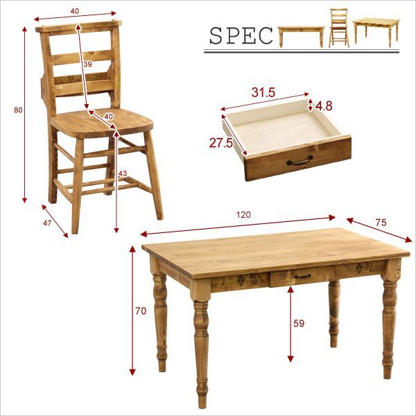 | 商品の特徴 | ※この商品は北海道・沖縄県・離島にはお届けできません、ご了承ください。 ※複数店舗で販売しているため、在庫切れとなるケースがございます。 ※お届け日時につきましては、ご購入前でもお気軽にご相談ください。 木のぬくもりを感じる天然木のダイニングセットです! 引き出しやガタつき防止アジャスター付きで機能も充実! テーブル、チェア4脚のセット!あたたかいデザインがお部屋を明るく演出します! カラーは定番で優しい色合いのナチュラル! チェア:(約)幅40x奥行き47x高さ80cm(座面43cm) テーブル:(約)幅120x奥行き75x高さ70cm ※商品重量:テーブル(約)20.5kg チェア(約)4.5kg(一脚あたり) 素材 チェア:天然パイン材仕上げ 自然オイル塗装 ※脚裏にフェルト付き テーブル:天然パイン材仕上げ 自然オイル塗装 ※引き出し取手鋳物付き テーブル/お客様組立商品です。 チェア/完成品でのお届けです。 ※ご注文後のキャンセルはご遠慮ください ※お客様都合による返品・交換はお受けいたしかねます ※当社提携倉庫より発送いたします。ご注文いただきました地域により発送場所がかわることがございます。 |
