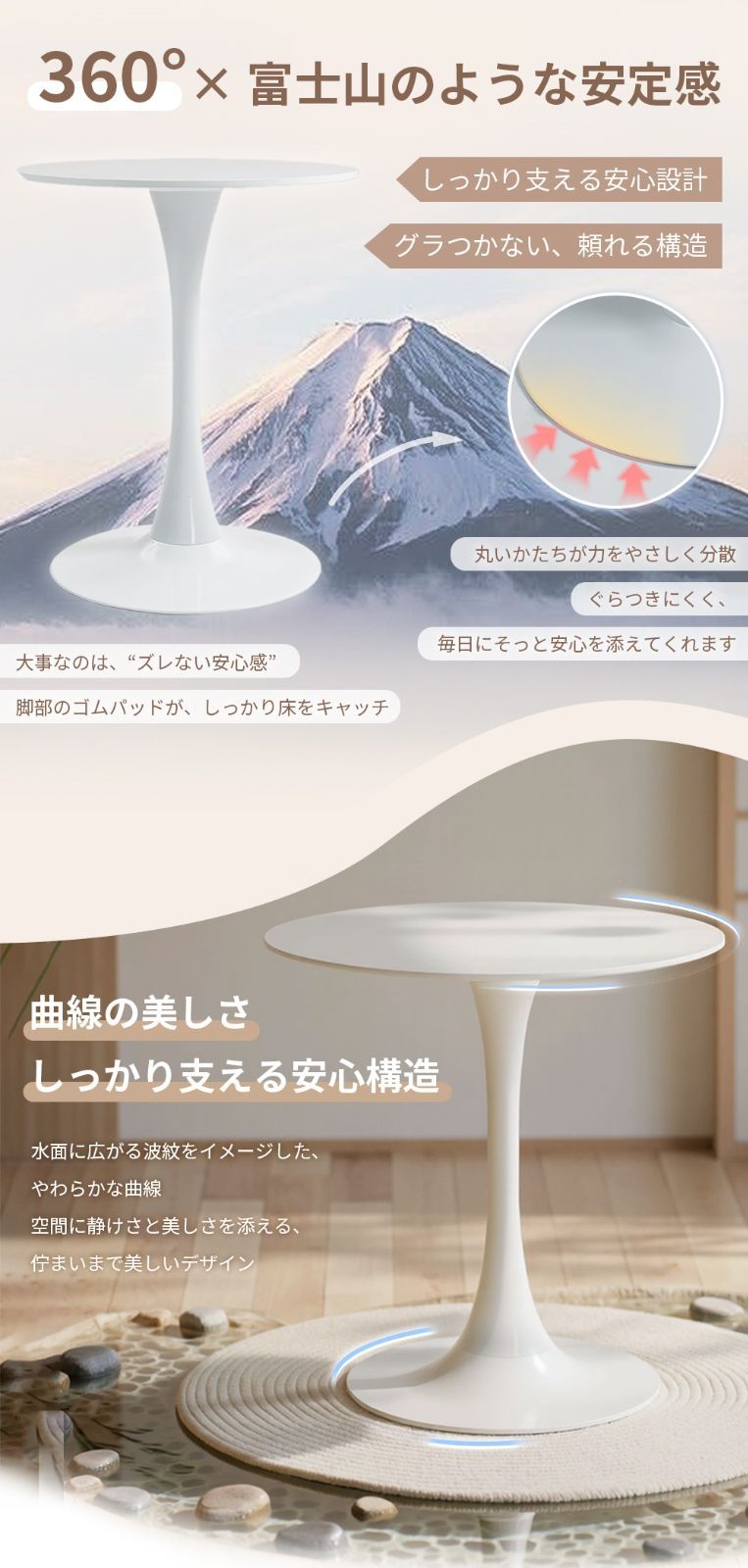 | 商品の特徴 | 【美しい曲線のデザイン】 やわらかな曲線を取り入れた円形のダイニングテーブルで、どんなインテリアにも優しく調和します。シンプルながら、エレガントな印象を与えます。 【明るいホワイトカラー】 鮮やかなホワイトカラーは、お部屋に明るさと広がりをもたらし、リビングやダイニングを洗練された空間に変身させます。 【簡単組み立て】 複雑な工程がなく、特別な道具も必要ありません。女性一人でも手軽に組み立て可能で、時間をかけずに完成します。 【高強度で安定性のあるスチール脚】 高耐久のスチール脚を採用し、安定感が抜群。長期間の使用にも耐えられます。 【お手入れ簡単】 ホワイトの美しい表面は、簡単に拭き取ることができ、汚れがつきにくく、日々のお手入れが非常に楽です。 |