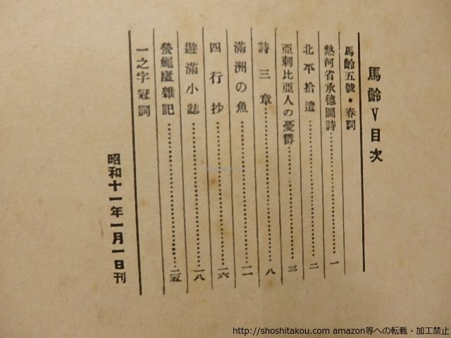 | 商品の特徴 | (雑誌)馬齢 佐藤惣之助随刊個人誌 初巻第五号 / 佐藤惣之助 雑誌)馬齢 佐藤惣之助随刊個人誌 初巻第五号⁄佐藤惣之助⁄私家版1936 ( 昭和11年 ) 表紙シミ 少キレ 24p 非売品「愛好者及び特に要求せらるゝ人々にのみ贈る。」 「熱河省承徳図詩」「北平拾遺」「亜剌比亜人の憂鬱」「満洲の魚」「遊満小誌」ほか 詩俳句小説随筆 / A5判 / 私家版 (雑誌)馬齢 佐藤惣之助随刊個人誌 創刊号 初巻第一号 ⁄ 佐藤惣之助※函・カバー・帯・月報・その他付属品類がある場合は明記します。特筆なき部位は経年並です。 雑誌)馬齢 佐藤惣之助随刊個人誌 初巻第五号(佐藤惣之助 ) ⁄ 書肆 田※メルカリ規定の「商品の状態」覧は、実際の商品の状態に関わらず一律で「やや傷や汚れあり」にしております。 ※当店の商品情報を無断使用したAmazonマーケットプレイスへの無在庫転売・及び詐欺サイトを確認しております。対策として画像に透かし文字を入れております。ご了承下さい。 雑誌)馬齢 佐藤惣之助随刊個人誌 初巻第五号(佐藤惣之助 ) ⁄ 書肆 田#佐藤惣之助 #私家版 雑誌)馬齢 佐藤惣之助随刊個人誌 初巻第五号(佐藤惣之助 ) ⁄ 書肆 田 |