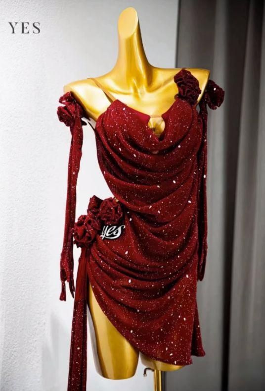 社交ダンス衣装 ラテンワンピースドレス ワインレッド 手袋付 オーダーメイドの検索結果