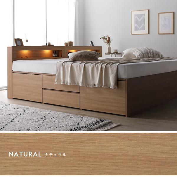| 商品の特徴 | 商品スペック 【ベッドフレーム本体】 サイズ(約) ショート丈セミシングル:幅83×奥行192.5×高さ80cm ショート丈シングル:幅99×奥行192.5×高さ80cm 通常丈シングル:幅99×奥行207.5×高さ80cm 通常丈セミダブル:幅120×奥行207.5×高さ80cm 通常丈ダブル:幅140×奥行207.5×高さ80cm ショート丈クイーン160(SHSS+SHSS):ショート丈セミシングル×2 ショート丈キング180(SHSS+SHS):ショート丈セミシングル+ショート丈シングル ショート丈ワイドキング200(SHS+SHS):ショート丈シングル×2 通常丈ワイドキング200(S+S):通常丈シングル×2 通常丈ワイドキング220(S+SD):通常丈シングル+通常丈セミダブル 通常丈ワイドキング240(S+D):通常丈シングル+通常丈ダブル 通常丈ワイドキング240(SD+SD):通常丈セミダブル×2 通常丈ワイドキング260(SD+D):通常丈セミダブル+通常丈ダブル 通常丈ワイドキング280(D+D):通常丈ダブル×2 ※床面までの高さ:42cm 材質 本体:合成樹脂化粧パーティクルボード(メラミン) すのこ:単板積層材(LVL) 機能 2口コンセント(1500W):ショート丈セミシングル/ショート丈シングル/通常丈シングル/通常丈セミダブルは右側に2口×1つ、通常丈ダブルは左右両側に2口×2つ LED照明:ショート丈セミシングル/ショート丈シングル/通常丈シングル×1、通常丈セミダブル/通常丈ダブル×2 耐荷重(約) ショート丈セミシングル/ショート丈シングル/通常丈シングル本体:120kg 通常丈セミダブル本体:180kg 通常丈ダブル本体:200kg 引き出し:各15kg カラー グレージュ、ブラウン、ホワイト、ナチュラル 生産国 中国 梱包サイズ・重量(約)梱包数:ショート丈セミシングル・ショート丈シングル・通常丈シングル・通常丈セミダブル4、通常丈ダブル5 ショート丈セミシングル:(1)87×37.5×15.5cm・9kg、(2)86×45×12cm・18kg、(3)91×45×14cm・25kg、(4)63×45×18cm・24kg ショート丈シングル:(1)103×37.5×15.5cm・11kg、(2)102×45×12cm・19kg、(3)91×45×14cm・25kg、(4)63×45×18cm・24kg 通常丈シングル:(1)103×37.5×15.5cm・11kg、(2)102×45×12cm・22kg、(3)98×45×14cm・27kg、(4)68×45×18cm・24kg 通常丈セミダブル:(1)123×37.5×15.5cm・13kg、(2)122×45×13cm・36kg、(3)98×45×14cm・27kg、(4)68×45×18cm・24kg 通常丈ダブル:(1)144×46×8.5cm・22kg、(2)100×45×13cm・21kg、(3)98.5×45.5×14.5cm・25kg、(4)69×46×20cm・27kg、(5)144.5×38×15cm・15kg 【商品に関するご注意】 ※通常丈ワイドキング240(S+D)/260(SD+D)/280(D+D)は2025年11月中旬頃の入荷予定です。入荷時期は前後する場合がございますので、あらかじめご了承ください。 ・本商品はボンネルコイルマットレス・ポケットコイルマットレスの使用を前提に設計されています。 ・床板の上に直接乗ったり、薄手のマットレスや布団で使用すると、床板が破損する恐れがあります。 ・ベッドの上で立ったり、歩いたり、飛び跳ねないでください。怪我をしたり破損の原因になることがあります。 ・商品写真は通常丈セミダブルサイズ、厚さ15cm前後のマットレスを使用しています。(一部の写真を除く) 実際の大きさはスペックをご確認ください。 ・ホワイトにも木目があるデザインになります。あらかじめご了承ください。 ・本商品はお客様組立品です。プラスドライバーをご用意ください。 ‐2人以上での組み立てをおすすめします。 ‐商品の組み立て開始前に部材不足、破損がないか必ずご確認ください。 ・製造の都合上、粉塵のようなものが付着している場合がございます。人体に影響のあるものではございませんが、気になる場合は乾いた雑巾等で乾拭きをしてご使用ください。 ・開封した際に、製造時に使用した塗料や接着剤の臭気が残っている場合があります。化学物質に敏感な方はまれにアレルギー症状を起こす場合もありますので、開封直後は部屋の換気を十分に行ってください。よく絞った布で水拭きすると臭いが軽減される場合もあります。 ・本商品を壁につけて設置すると壁に傷をつけたり、色移りやカビが発生する可能性があります。必ず少しすきまを開けて設置してください。 ・家庭でのご使用を目的としています。業務用でご使用しないでください。 ・画像や商品情報には、色違いやサイズ・セット違いの商品が載っている場合がございます。ご注文前に色・サイズ・セット内容のご確認をお願いいたします。 ・写真の色調はモニターの機種や設定により実際の商品と異なる場合があります。 ・製品のデザイン・仕様・梱包は予告なく変更することがございます。あらかじめご了承ください。 【マットレス】 ・3つ折りポケットコイルマットレス サイズ(約) ショート丈セミシングル:幅80×長さ180×高さ7cm ショート丈シングル:幅97×長さ180×高さ7cm 通常丈シングル:幅97×長さ195×高さ7cm 通常丈セミダブル:幅120cm×長さ195×高さ7cm 通常丈ダブル:幅140×長さ195×高さ7cm 詰め物(コイル) 線径2.0mmポケットコイルスプリング、SWRH72B-硬鋼線C種 コイル数/ショート丈セミシングル:336、ショート丈シングル:420、通常丈シングル:450、通常丈セミダブル:570、通常丈ダブル:660 詰め物(その他) ウレタンフォーム、フェルト、不織布 外