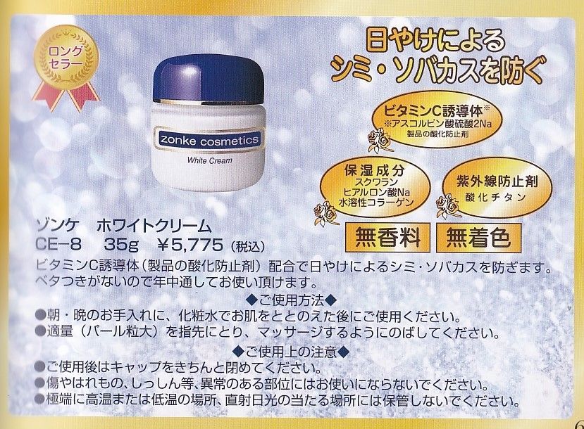 | 商品の特徴 | ゾンケ ホワイトクリーム CE-8 35g|スキンケア|商品一覧|株式会社ゾンビタミンC誘導体(製品の酸化防止剤)配合で、お肌を改善する可能性があります。 乾燥したお肌のきめを整えてお肌にハリとツヤを与え、日焼けによるシミ・ソバカスを防ぐクリームです。軽いタッチでお肌になじみ、ベタつきがないので年中通してお使い頂けます。 当社は正規代理店です。 (只今、消費税、送料は当店で負担) ゾンケ ホワイトクリーム CE-8 | スキンケア | 商品ラインナップ インボイス登録番号 T7150001011017 スーパーXG777 | 工業用 | セメダイン株式会社この商品は、北海道、沖縄県、離島への発送は出来ません。 #洗顔 #売れ筋 #クリーム |