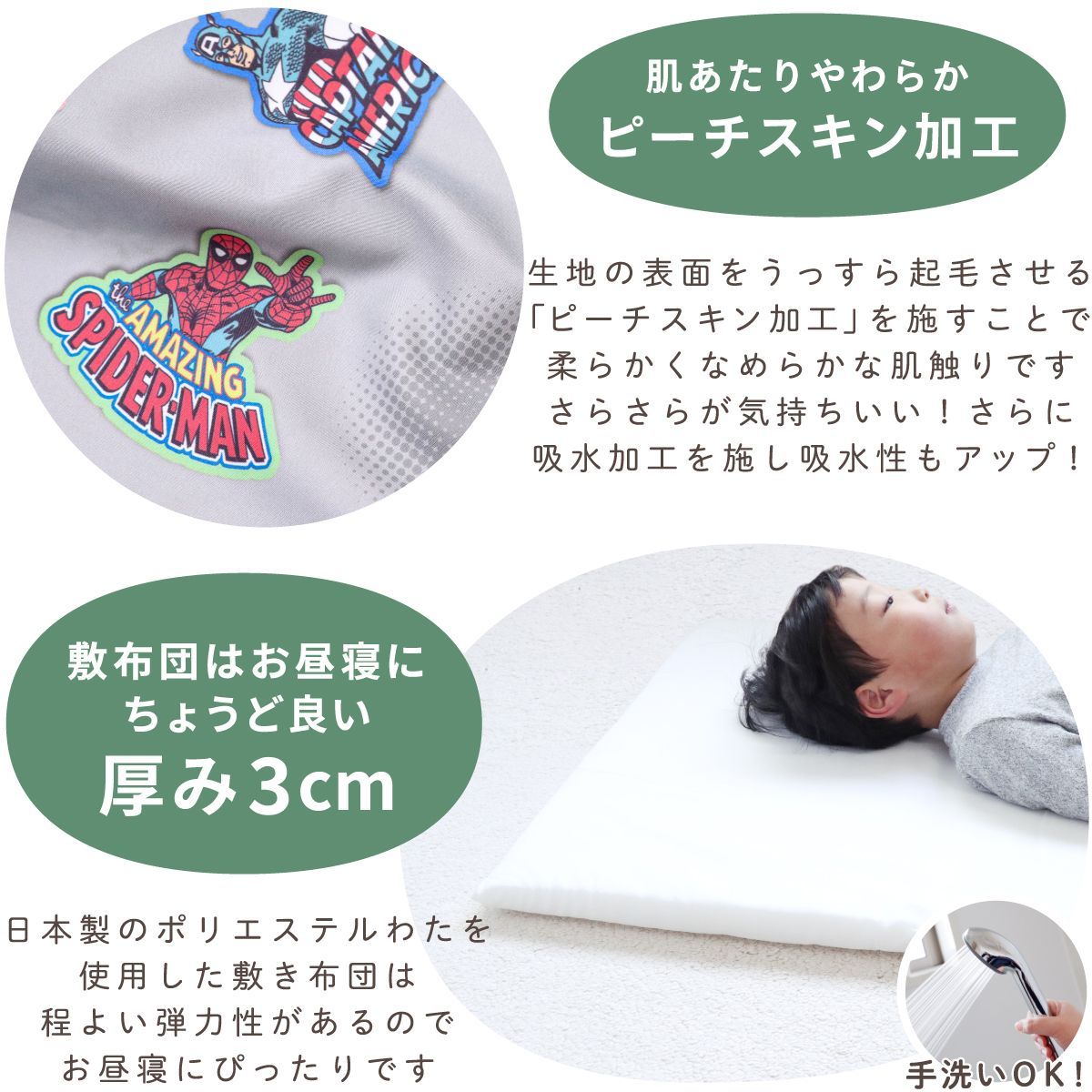 | 商品の特徴 | 【シンプルセット】おひるね3点セット <スパイダーマン アイアンマン キャプテンアメリカ ハルク> マーベル アベンジャーズ お昼寝布団 保育園 3点セット 70×120cm<MARVEL Avengers Spider-Man Iron Man Captain America The Hulk> 【1】敷布団カバー(コの字型ファスナー付き) <75×125cm> マーベル アベンジャーズ お昼寝布団 保育園 3点セット 70×120cm お昼寝布団セット 洗える敷布団単品+防水バッグ ファスナー お昼寝バッグ 敷き布団 キッズ OHFポリエステル100% マーベル アベンジャーズ お昼寝布団 保育園 3点セット 70×120cm お昼寝布団セット 洗える敷布団単品+防水バッグ ファスナー お昼寝バッグ 敷き布団 キッズ OHF【2】敷布団中芯(固綿タイプ) <70×120cm(厚み約3cm)> お昼寝布団 保育園 3点セット(ベビー用寝具・ベッド側生地:ポリエステル65%・綿35% 中綿:ポリエステル100% 【3】撥水バッグ <40×70×マチ20cm> 表側:ポリエステル100%(裏側にポリウレタンラミネート加工) ≪吸水加工ピーチスキン生地≫ 汗っかきな赤ちゃんも快適な睡眠ができるように考えられた、吸水加工を施したなめらかでさらっとした肌触りのピーチスキン生地を使用。 オールシーズン快適にご使用いただけます。 ≪こだわりの敷き布団≫ 敷き布団は日本製のポリエステルわたを使用し、程よい弾力性があるのでお昼寝にぴったりです。 3つ折りにして付属のバッグに収納できます。 ※折り目のない1枚タイプです。 ※反発力のある固綿仕様のため、バッグから出すと真っ直ぐに戻せます。 ≪はっ水&防水のお昼寝バッグ≫ 雨の日も安心の撥水バッグは持ち運びに便利な肩掛けタイプ。 マチ付きなのでたっぷり収納。 ファスナーがサイドにまで付いているので出し入れがしやすいです。 さらに内側は防水仕様で濡れたものや汚れたものでも安心して持ち帰ることができます。 ≪おなまえが書けるタグ付き≫ 布団カバーと撥水バッグには にじみにくい素材を使用したおなまえタグが付いています。 ≪全てご家庭で洗えます≫ 保育園では毎日使うお昼寝布団だから、全部洗ってあげたい! 汚れたら防水バッグで持ち帰り、すぐに洗えて清潔です! 当店では地球環境の保全・改善のため、エコ活動の一環として、最小限のエコ梱包で発送しております。 このため、ビニール袋は使用せず、段ボールケースに直接お入れしております。 ※新生児の睡眠には使用しないでください。うつ伏せでのご使用はできません。 ※お昼寝敷布団は、保育園・幼稚園のお昼寝用として、持ち運びに便利なよう簡易的に作られていますので、赤ちゃんの長時間の睡眠には適しておりません。 (C)2025 MARVEL 年末年始休業のお知らせ 12/27(土)~1/5(月)まで年末年始休業とさせていただきます。 <出荷スケジュール予定> 12/26(金) AM8:59までのご注文 ⇒ 12/26(金)当日出荷 12/26(金) AM9:00以降のご注文 ⇒ 1/6(火)~順次出荷 ※各種お支払いのご入金確認完了時点となります。 ※ご注文状況により発送までにお時間をいただく場合がございます |