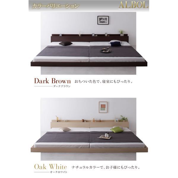 | 商品の特徴 | フロアベッド ワイドキング220ALBOLボンネルコイルマットレスその他の画像など詳細はこちら(PC版)でご確認ください。 連結ベッド フロアベッド ワイドキングサイズ 220cm S+SD ポケットコイルマットレス付き 片面仕様 ホワイト 棚付き 日本製 ベッド Tonarine トナリネ 送料無料関連商品 本商品のサイズ、色違い、関連商品はこちら 商品内容 ポイント20倍フロアベッド ワイドキング220ALBOLボンネル家族一緒に寝られる! 選べる7サイズ!! Q、KWK200、WK220、WK240、WK260、WK280 未使用)ローフロア⁄ワイドキングベッド 幅220cm フレーム&マットレスキングサイズより大きい! ワイドキング 220 (S+SD) ボンネルコイルマットレス付 ボンネルスーパーワイドキングサイズベッド、最大約280cm!! ≪ずっと、一緒に。永くつかっていける、スーパーワイドキングサイズ≫ ゆったりと寝たい、そんな夫婦におすすめの、スーパーワイドキングサイズ。 一緒に寝たいけれど、睡眠中は寝返りも気になるし、すこし距離を保ちたい。そんな2人におすすめのサイズです。体の大きなご夫婦もゆったりと寝られます。 ≪未来の事も考えて。≫ 将来、お子様が生まれても、この広さなら、家族全員で寝る事ができます。 ≪大きなサイズは、選べる7サイズ!お部屋に合わせて、ご家族の人数に合わせて、お好みのサイズを選ぶ事ができます。≫ クイーンサイズ、キングサイズ、ワイドキング200、ワイドキング220、ワイドキング240、ワイドキング260、ワイドキング280 売れ筋はこの4サイズ! ご夫婦の方は、クイーンサイズがおすすめです。 お子様がおひとりなら、ワイドキング200がおすすめです。 お子様がおふたりなら、ワイドキング240がおすすめです。 ワイドキング280ならお子様が3人以上いても寝られる広さです! ≪マットレスの間も、ヘッドボードもぴったり。≫ 通常ベッドをふたつ並べると、すきまがあいてしまいます。このベッドなら、ヘッドボードも、マットレスも、隙間なくぴったりくっつきます。 ヘッドボードとフットボードの2カ所を金具でがっちりと固定します。なので、お子様が上で暴れても、ベッドが動いて離れていくという事はありません。 ≪ふたつのベッドを組み合わせているので、2台のベッドとしても使用できます!≫ 大人がそのまま使用しても。 お子様に使用してもらっても。 ≪飽きずにずっと使えるシンプルデザイン!≫ 今は夫婦で使って、将来は子供が使うかもしれません。 永く使って頂きたいので、飽きの来ない、スタイリッシュでかつシンプルなデザインに仕上げました。 ≪コンセント位置も自由に変えられます。≫ お部屋のレイアウトに合わせて自由に配置して欲しいから、コンセント位置を、左右どちらにもつけられる仕様にしました。 コンセントをベッドの中心に持ってくる事も、両端に配置する事も可能です。 ≪お手入れらくらく、価格と品質の両立を実現しました。≫ リーズナブルな価格と確かな品質を両立する為、表面には特殊な加工を施しております。強化樹脂で仕上げてあるので、お掃除もらくらく。お子様にシールを貼られたとしても、さっとはがす事ができます。" ≪ロータイプなので、圧迫感が無く、空間がすっきり。≫ 通常のベッドを2台並べて置くと、その大きさから、どうしてもお部屋に圧迫感を感じてしまいます。 ロータイプベッドなら、この大きさでも圧迫感がなく、お部屋を広々と感じられます。 マットレス面の高さが低いので、小さなお子様にも安心の高さです。 ≪color≫ ダークブラウン ・・・おちついた色で、寝室にもぴったり。 オークホワイト ・・・ナチュラルカラーで、お子様にもぴったり。 商品スペック ベッドフレーム 【サイズ】 長さ×高さ(約) 全サイズ共通:214cm×45cm 幅(約) クイーン(SS×SS):170cm キング(SS×S):190cm ワイドK200(S×S):210cm ワイドK220(S×SD):233cm ワイドK240(SD×SD):256cm ワイドK260(SD×D):273cm ワイドK280(D×D):290cm マットレス面までの高さ ボンネルコイルマットレス (約)18cm ポケットコイルマットレス (約)19cm 国産ポケットコイルマットレス (約)22cm マルチラススーパースプリングマットレス (約)18cm デュラテクノマットレス (約)21cm 羊毛入りデュラテクノマットレス (約)25cm 【材質】 合成樹脂化粧繊維板(メラミン) 【生産国】 中国 【重量】 セミシングル:(約)23kg シングル:(約)25kg セミダブル:(約)27kg ダブル:(約)29kg 【梱包サイズ・梱包重量】 セミシングル:(約)48×108×19cm・24kg シングル:(約)48×108×19cm・26kg セミダブル:(約)48×128×19cm・28kg ダブル:(約)48×148×19cm・31kg ※各サイズは概算になります。 ※お客様組立品です。 ※組立てにプラスドライバーをご用意下さい。 ※ベッドのフレームはスプリングマットレス使用時の基準で強度計算されておりますので、床板に直接布団等を敷いてご使用になりますと破損の原因となる場合があります。 本品をご使用になる場合には、必ずスプリングマットレスをご使用下さいますようお願い致します。 ※1年保証は一部マットレスのみとな