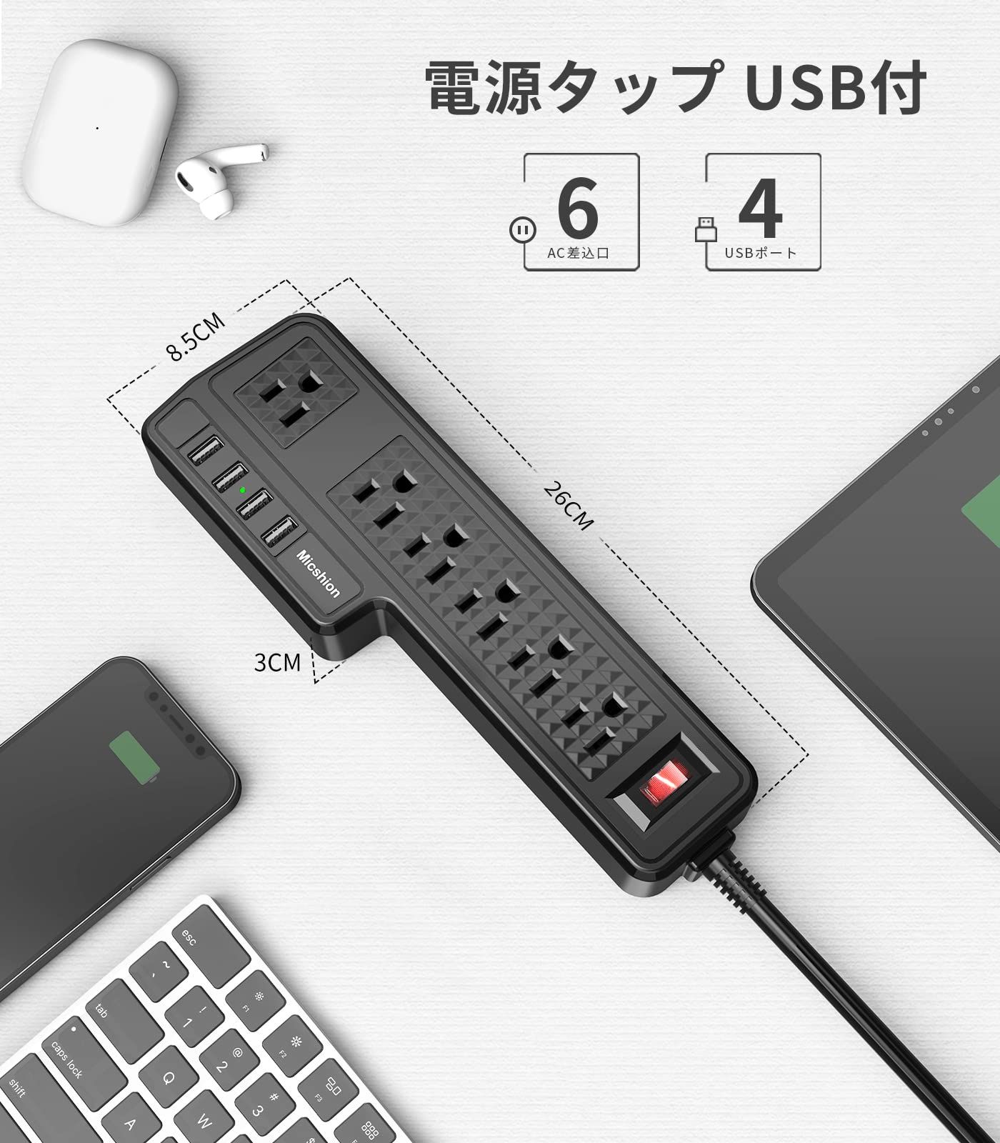 【迅速発送】Micshion USB電源タップ コンセント 個別スイッチ 6AC充電口(110-240V)+4USBポート(3.4A/5V)壁取付用固定フック 急速充電可能 雷ガード 過負荷保護 2m延長コード オフィス/家庭給電の検索結果