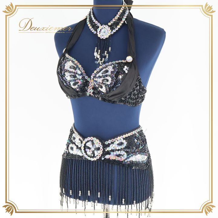 ベリーダンス オリエンタル 衣装 セット ブラック系 黒 シルバー ビーズ スパンコールラメ ラインストーン トップス ベルト 発表会 舞台 イベント ベリーダンス衣装 コスチューム パフォー